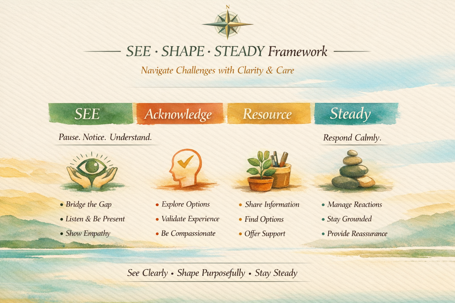 SEE → Pause. Notice. Understand. Observe the situation, seek perspective, get to the heart.
